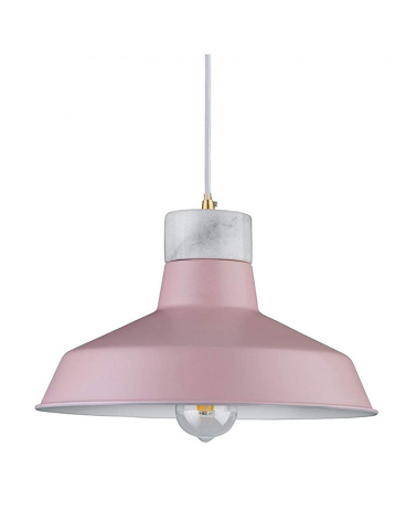Lámpara de techo en acabado en rosa fabricada en metal con detalle en mármol de estilo nórdico o industrial, cable con funda de tela.
