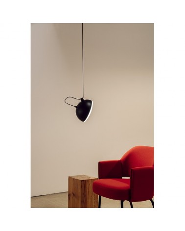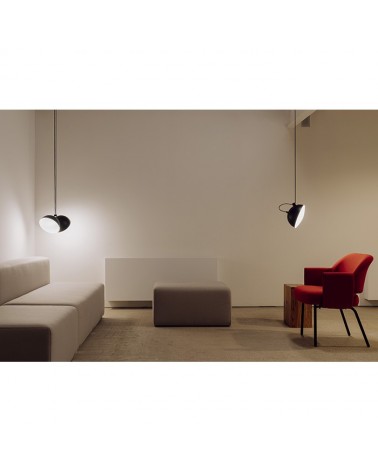 Lámpara de diseño colgante, permite gracias a su accesorios permite la orientación individual de la lámpara, doble o triple. El peso y el volumen a través de sus múltiples posiciones generan un ritmo dinámico. Fabricado en España.