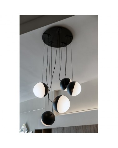 Lámpara de techo con 5 esferas de 16cm elegante y minimalista permite simular las fases de luna, diseñada por Francesc Rifé en Acero y cristal soplado, con multitud de combinaciones tanto en para suelo como pared, se ofrece en diferentes colores, negro y visón.