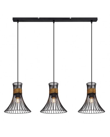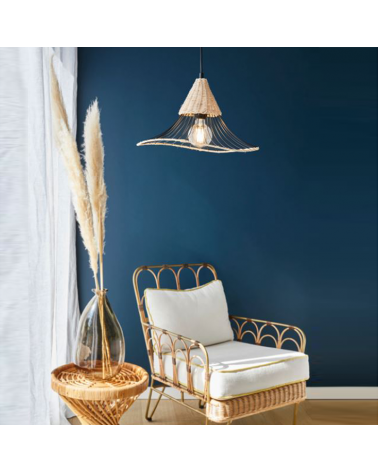 Lámpara de suspensión de elegante diseño con formas onduladas fabricada de varillas de metal, con un cubrezócalo de ratán. Con portalámparas metálica casquillo E27. Al estar realizado con varillas de metal se hacen visibles las bombillas de manera que se podrían elegir unas bombillas decorativas haciendo la luminaria más atractiva. Bombilla no incluída.