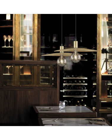 Lámpara de suspensión fabricada de metal acabado oro envejecido. Con portalámparas casquillo E27. Se hace visible la bombilla de manera que se podría elegir una bombilla decorativa haciéndo la luminaria más atractiva. Disponible misma colección lámpara de mesa. Bombilla no incluída.