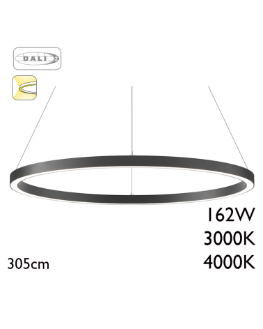 Preciosa lámpara de techo de diseño circular LED integrado de 162W que aporta luz directa a suelo y luz indirecta a techo. Disponible en temperatura de color de luz en 3000K y 4000K. Fabricada de aluminio y acabado negro mate de 305cm de diámetro. Es perfecta para iluminar espacios actuales y minimalistas. Regulación de intensidad de luz. Driver Dali, también disponible y compatible con las tecnologías On/Offi, Push, Casambi y Tuya.