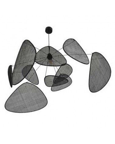 La lámpara de techo que se presenta es una pieza de notable elegancia y singularidad. Consta de diez pantallas planas confeccionadas en caña acabado negro, lo que le otorga un acabado exquisito y orgánico. Estas pantallas están dispuestas alrededor de una estructura central de metal negro.