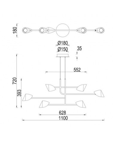 Esta moderna lámpara de techo tiene una medida de 110cm de ancho, ofreciendo una amplia cobertura de iluminación para cualquier espacio. Está diseñada con 6 pantallas distribuidas de manera equilibrada, lo que proporciona una iluminación uniforme y decorativa.
