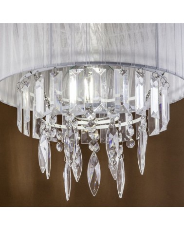 Lámpara de techo de estilo elegante con pantalla de tela blanca con plisado y colgaduras en forma de prisma y lágrimas. Sus piezas de techos crean un reflejo con matices de arcoíris precioso. Rememora las lámparas clásicas del pasado aportando lujo y elegancia al espacio.