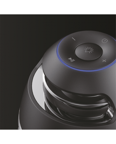 Lámpara fabricada en plástico acabado antracita. Contiene también altavoz el cual funciona a través de Bluetooth 5W. Debido a su protección IP65, se puede utilizar en exteriores. La forma de parpadeo de LED figuran como si se tratara de velas .