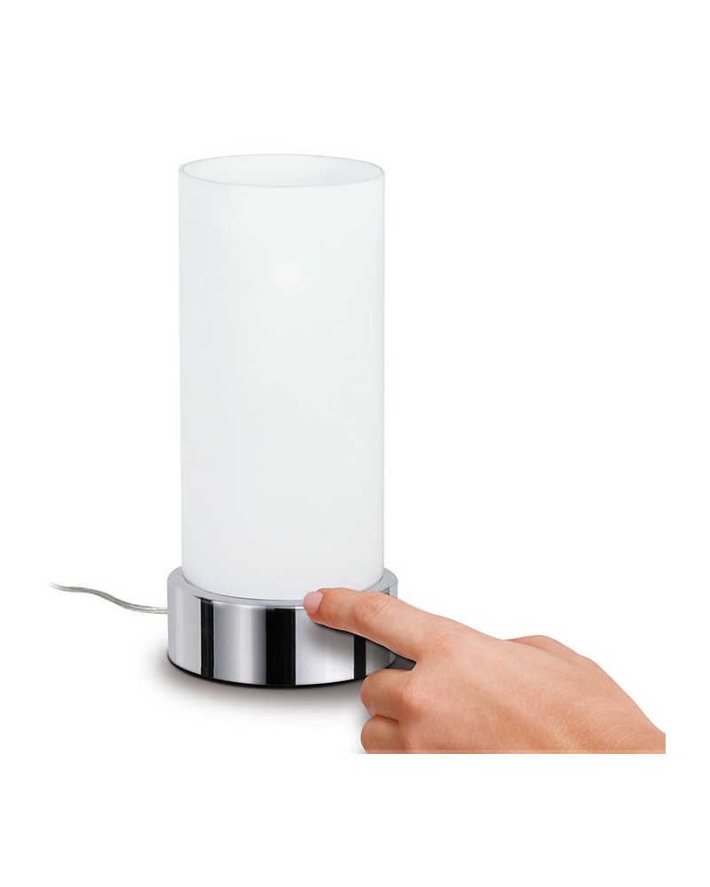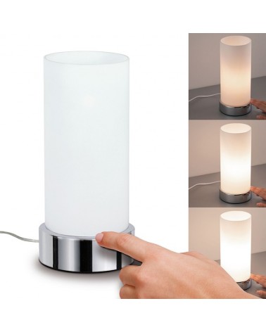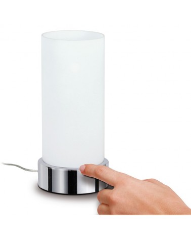 Diseño fresco e inteligente, fácil de usar. Controlado táctil y pantalla cilíndrica de cristal opal con base cromada. Perfecto para mesita de noche o en el alféizar de la ventana. Recomendable con bombillas halógenas o incandescentes.