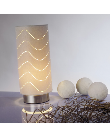 Lámpara de sobremesa con pantalla de tela con dibujo ondulante, elegante y sofisticada es ideal para mesitas de noche por su control táctil que permite una rápido control de encendido y apagado.