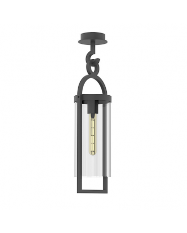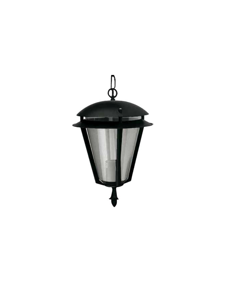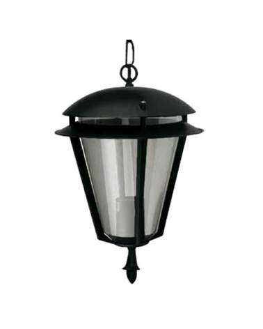 Colgante de exterior con difusor transparente de policarbonato, de una luz LED, bajo consumo, o incandescente máx. 100W, rosca E27. Cuerpo en aluminio inyectado. Portalámparas cerámico. Protección IP44. Color: negro.