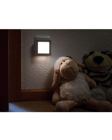 Luz nocturna infantil quitamiedos enchufable blanca cuadrada con sensor de anochecer
