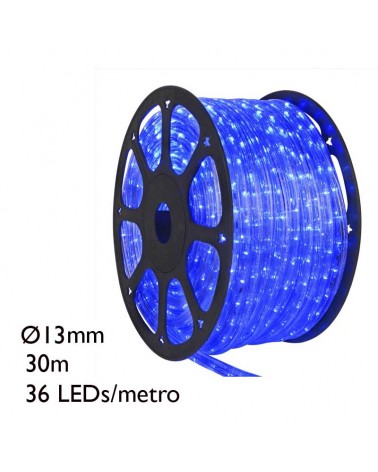 Bobina de 30 metros de tubo luminoso LED luz disponible en colores blanco, cálido, azul, verde,rojo o amarillo. Apto para exteriores, IP54. Baja tensión 24V. Muy bajo consumo eléctrico 45W. Total LEDs: 1080 (36 leds por metro). Ángulo luz: 360º.