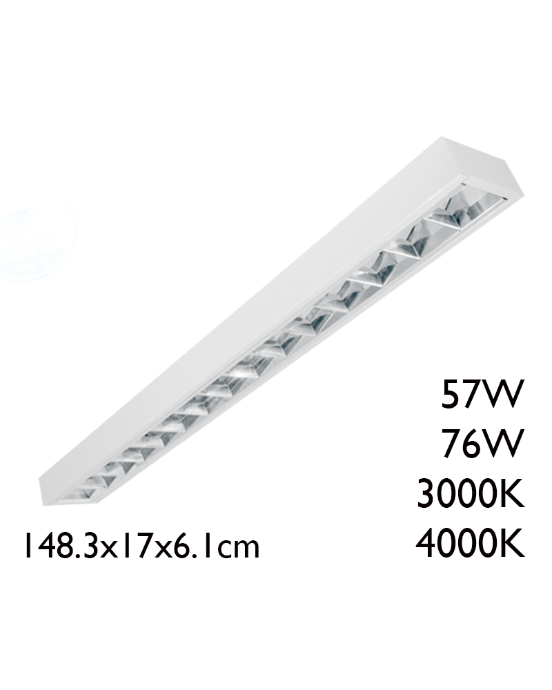 Lámpara de superficie LED, diponible en 57W y 76W. Medidas 148,3x 17x6,1cm. Disponible en 3000K o 4000K, y bajo pedido en 5000K y 6500K. Material acero acabado en blanco. Tiene una larga vida con mas de 50.000 horas. Fabricado con materiales de alta calidad diseñado en España. Disponibilidad control por bluetooth y regulable por sistema Dali, bajo pedido.