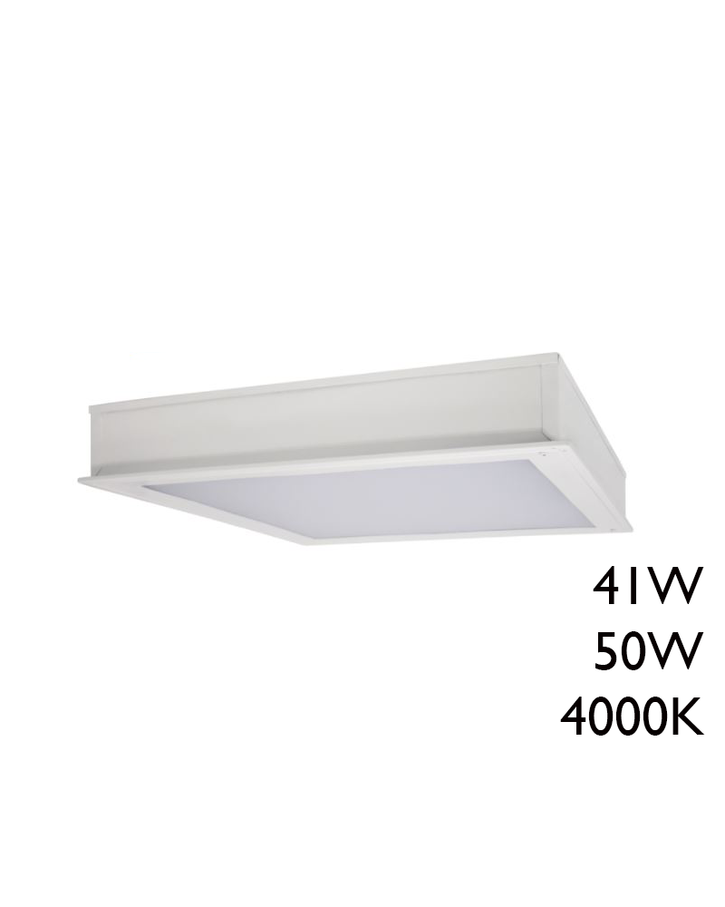 Pantalla de empotrar LED. Disponible en 41W y 50W medidas 60x60cm. Disponible en 3000K o 5000K, bajo pedido. Material acero acabado en blanco. Tiene una larga vida con mas de 50.000 horas. Fabricado con materiales de alta calidad diseñado en España. Disponibilidad control por bluetooth y regulable por sistema Dali, bajo pedido.