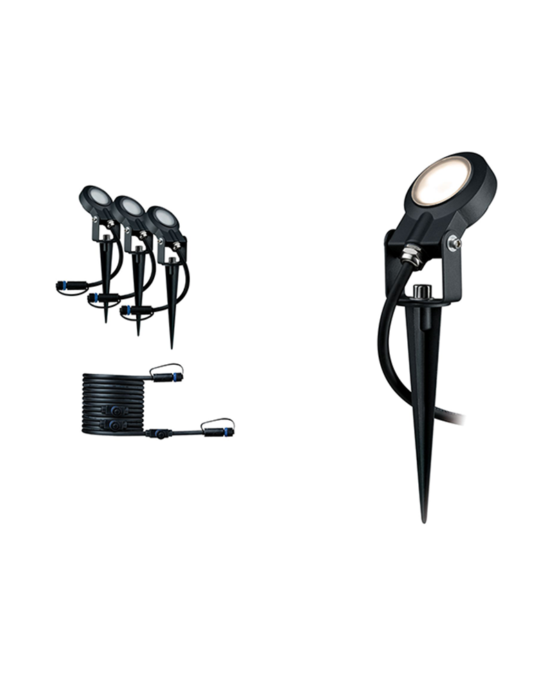Juego para ampliar referencia 142-19-93696: set de 3 piquetas LED 3x6W luz cálida 3.000K IP67 100º con 5 metros de cable y 4 salidas. Sin transformador. Alta luminosidad: 3 x 520 Lúmenes. Es ideal para la iluminación individual de los rincones y las plantas favoritas de la casa, el jardín y la terraza. El sistema de cables de tensión continua de 24V LED es seguro y muy fácil de instalar. A diferencia de las instalaciones de 230V, los amantes de los jardines no tienen que excavar zanjas profundas con protecciones múltiples: los cables también pueden estar tendidos sobre la superficie y, con IP68, cuentan con la máxima protección contra la penetración de agua. El ingenioso sistema de cables se puede ampliar hasta una longitud de 50 metros. De esta manera, los amantes del jardín pueden posicionar y ampliar su iluminación con total flexibilidad: basta con conectar y dejar que la luz haga su efecto. Todas las luminarias son regulables, están protegidas contra la corrosión y son resistentes al agua (IP67). Puede conmutar y regular sus luminarias con mando a distancia o control ZigBee 3.0, opcional.