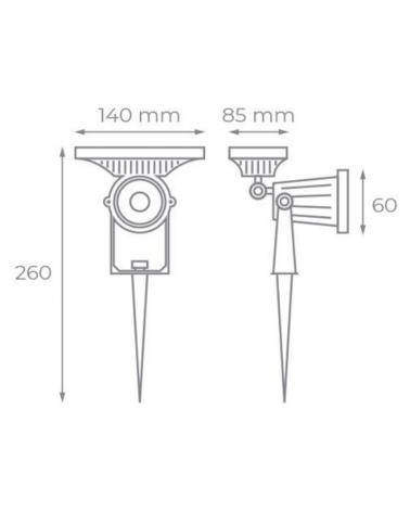 Pincho para jardín con placa solar, con un tiempo de carga de 4-6 horas y una autonomía de 8-10 horas. Potencia de 5W 600Lm, temperatura de color 3000K. Tiene un índice de protección de IP65. Fabricado en aluminio, ABS y difusor de policarbonato.