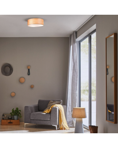 Elegancia y simplicidad en este plafón fabricado a mano en madera auténtica natural y de fácil cuidado combinada con cobre mate. Producto certificado según FSC, con madera procedente de bosques gestionados responsablemente
