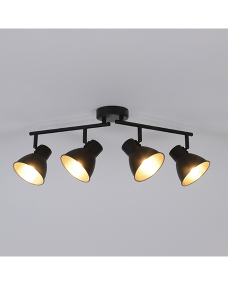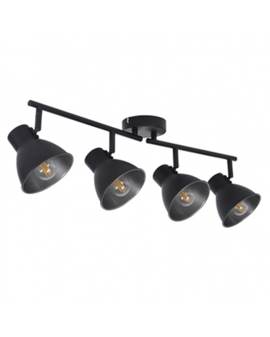 Regleta con 4 focos de estilo industrial. Fabricada en metal y acabado negro. Focos orientables para facilitar el posicionamiento de la luz y brazos articulados. Perfecta para el salón, cocina o dormitorio.