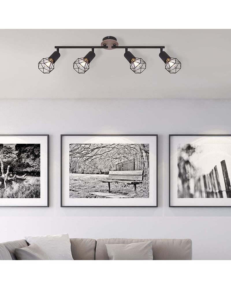 Lámpara de techo con 4 focos estilo industrial vintage negro acabado pantalla metal negro y base en maderaestilo industrial