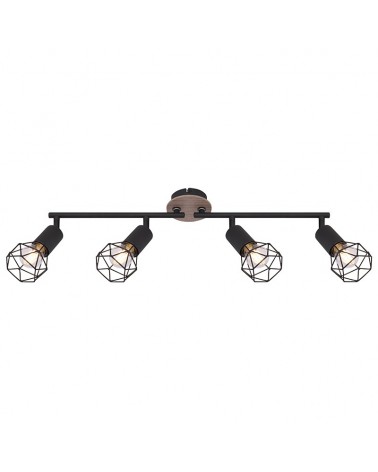 Regleta de techo vintage industrial 60cm con 4 focos oscilantes acabado portalamparas negro dorado latón base madera 4xE14 40W