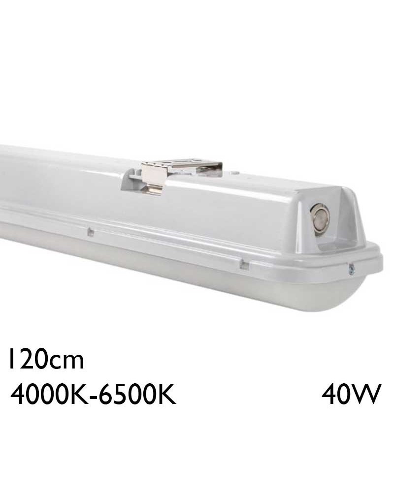 La regleta estanca LED de 120cm es una solución de iluminación eficiente y duradera, diseñada para ofrecer un rendimiento óptimo en una variedad de entornos. Con una potencia de 40W, proporcionando una iluminación eficiente, con la capacidad de ajustar la temperatura de color entre 4000K (blanco neutra) y 6500K (blanco día) para adaptarse a diferentes necesidades de iluminación, esta regleta es ideal para aplicaciones donde se requiere una iluminación flexible y de alta calidad.