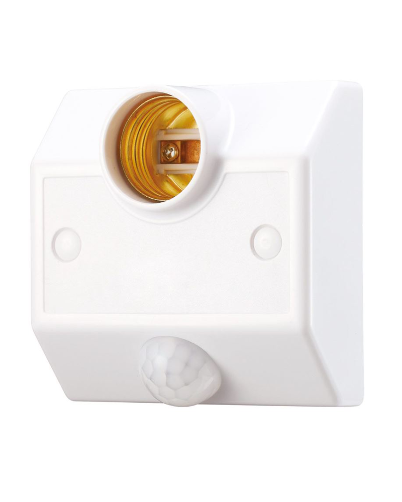 Sensor de presencia de superficie que funciona por infrarrojos. Con IP20. Funciona a 110-240V. Con casquillo E27, consumo 0,5W.