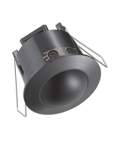 Sensor de presencia negro empotrable que funciona por infrarrojos. Carga máxima de 1200W (incandescente) ó 300W (LED o fluorescente)