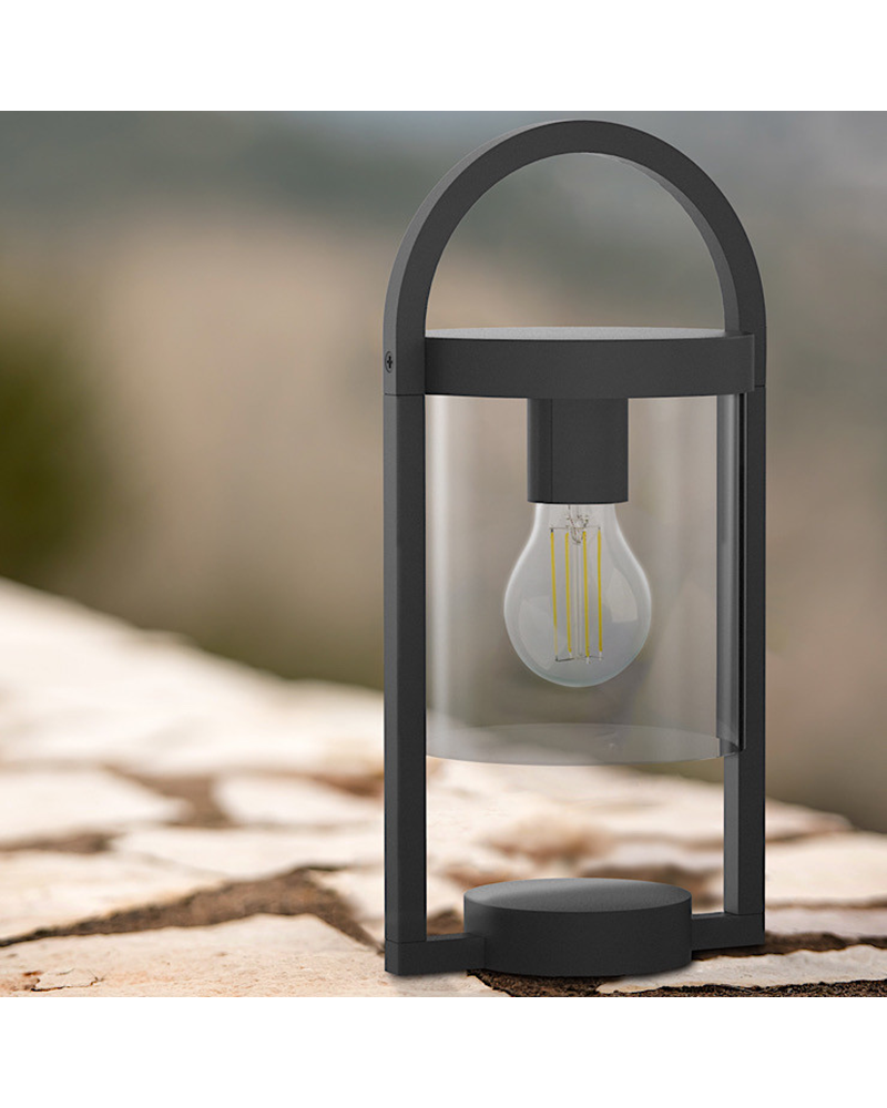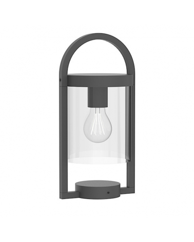 Lámpara sobremuro de 35,5cm. Fabricado de aluminio acabado gris oscuro y cristal transparente. Para bombilla con casquillo E27. Ideal para decorar e iluminar columnas y muros en exteriores. Con una protección IP54. Al ser visible la bombilla se podría elegir una bombilla decorativas haciéndo la luminaria más atractiva. Bombilla no incluída.