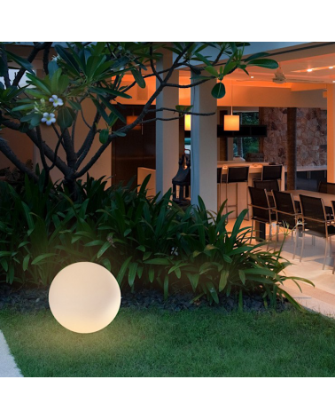 Lámpara para suelo forma de bola apta para exterior. Fabricada en policarbonato acabado en blanco de 50cm de diámetro. Portalámpara E27. Bombilla no incluída. Protección IP65. Perfecta para la decoración e iluminación de zona chill out, jardines, terrazas, hoteles, etc. Tiene también la posibilidad de conventirla en pincho de jardín utilizando una piqueta (ref. 222-1-1162222-1-1164222-1-1165) y también disponible una base para anclar al suelo (ref. 222-1-1163) (no incluidos). Accesorios disponibles: pincho y base metálica (consultar).