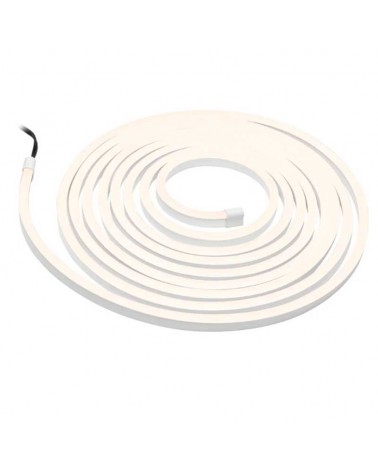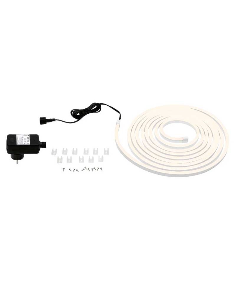 El conjunto incluye una fuente de alimentación de 230/24 V con cable y enchufe. La temperatura de color es de 3000K (blanco cálido) y cuenta con una protección IP65, lo que la hace resistente a chorros de agua. Además, su material flexible permite montarla en superficies planas o curvas. Con un sistema de enchufe sencillo para una instalación fácil, este sistema no es ampliable.