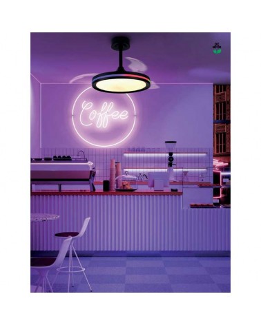 Acabado negro con aspas transparentes este ventilador se adapta perfectamente a tu estilo y decoración. Este ventilador plafón no solo refrescará tu espacio, sino que también se convertirá en un elemento decorativo destacado, fusionando funcionalidad y estética de manera armoniosa. Ofrece dos luces, una en la parte inferior tipo plafón permitiendo elegir entre tres tonalidades diferentes: cálida (3000K), neutra (4000K) y blanca (6500K) y otra alrededor del ventilador proporcionando luz RGB.